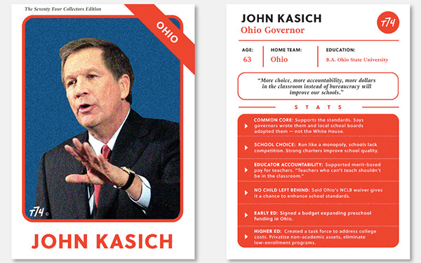 One of two Republican candidates who continues to support the Common Core standards (Jeb Bush is the other), Kasich said he would not tolerate failing schools, whether charter or public. The state’s charter school program has been harshly criticized amid financial and ethical scandals and academic failures; Kasich and the Ohio Legislature appear poised to fight their way toward reform.