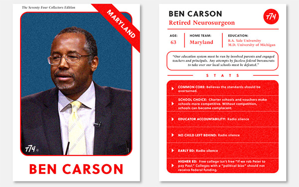 (See a brief summary of Carson’s education views on his presidential baseball card, and an overview of the higher ed issues that were